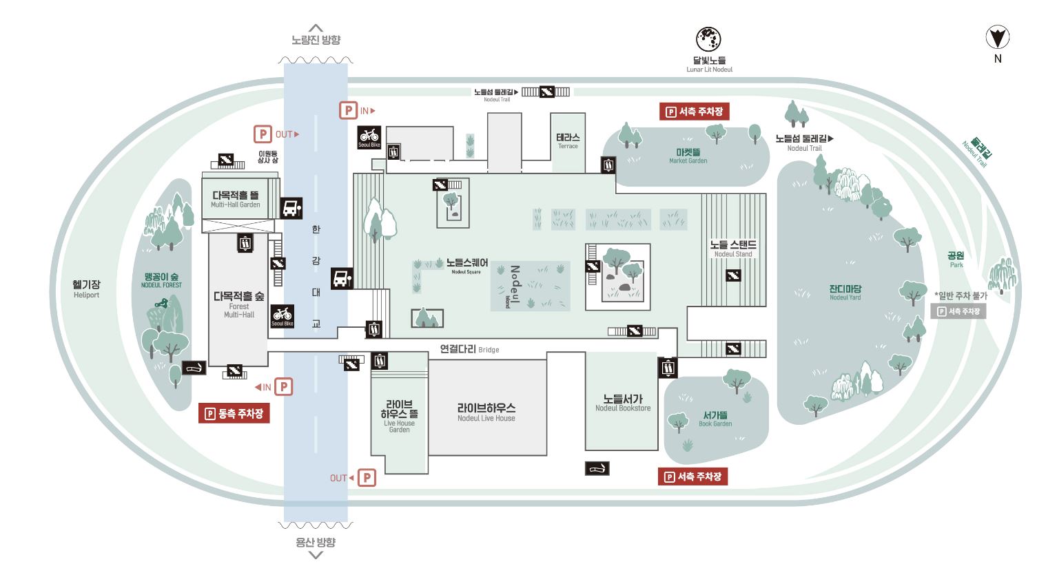 동측주차장 경우 주차대수도 적을뿐더러 바로 한강대교 위 노들섬 연결다리로 직행할 수 없다.