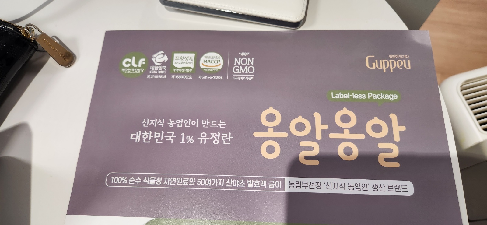 무항생제 유정란, 좋은 곡식과 환경을 제공해서 최상의 계란을 생산한다는 구쁘 유정란.
